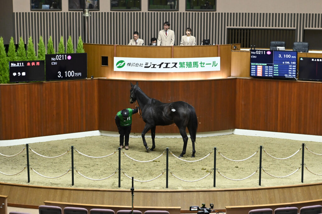 本年は35頭(受胎馬20頭、空胎馬15頭)を上場し、皆様の活発なお声がけを頂いた結果、ピカリ(上場番号211、父Twirling Candy、母Laudation)につけられた3,410万円をはじめ計24頭が落札されました。これもひとえに購買者、販売者各位のご協力によるものと、この場を借りて厚く御礼申し上げます。